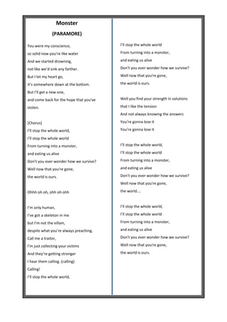 Monster - Paramore By Admin October 29 2017 P Leave a Comment. By Paramore You were my conscience so solid now youre like water We started drowning not like wed sink any further But I let my heart go its somewhere down at the bottom But Ill get a new one and come back for the hope that youve stolen Ill stop the whole world Ill stop the whole world From turning into a monster and eating us alive. Berikut ini lirik dan chord lagu Proof dari Paramore.
